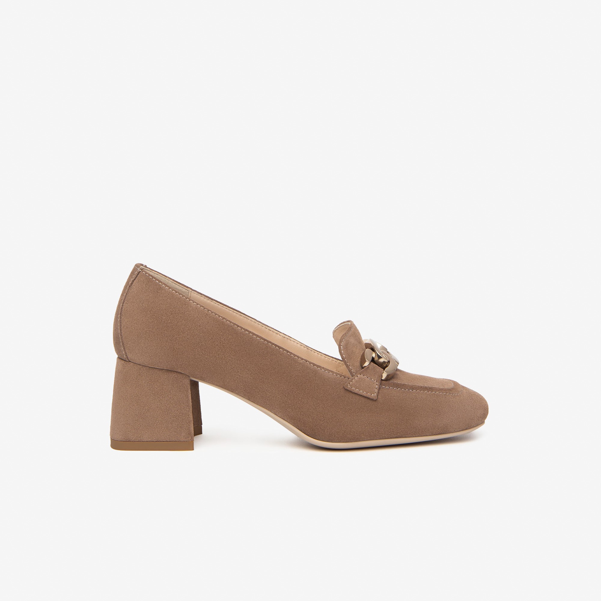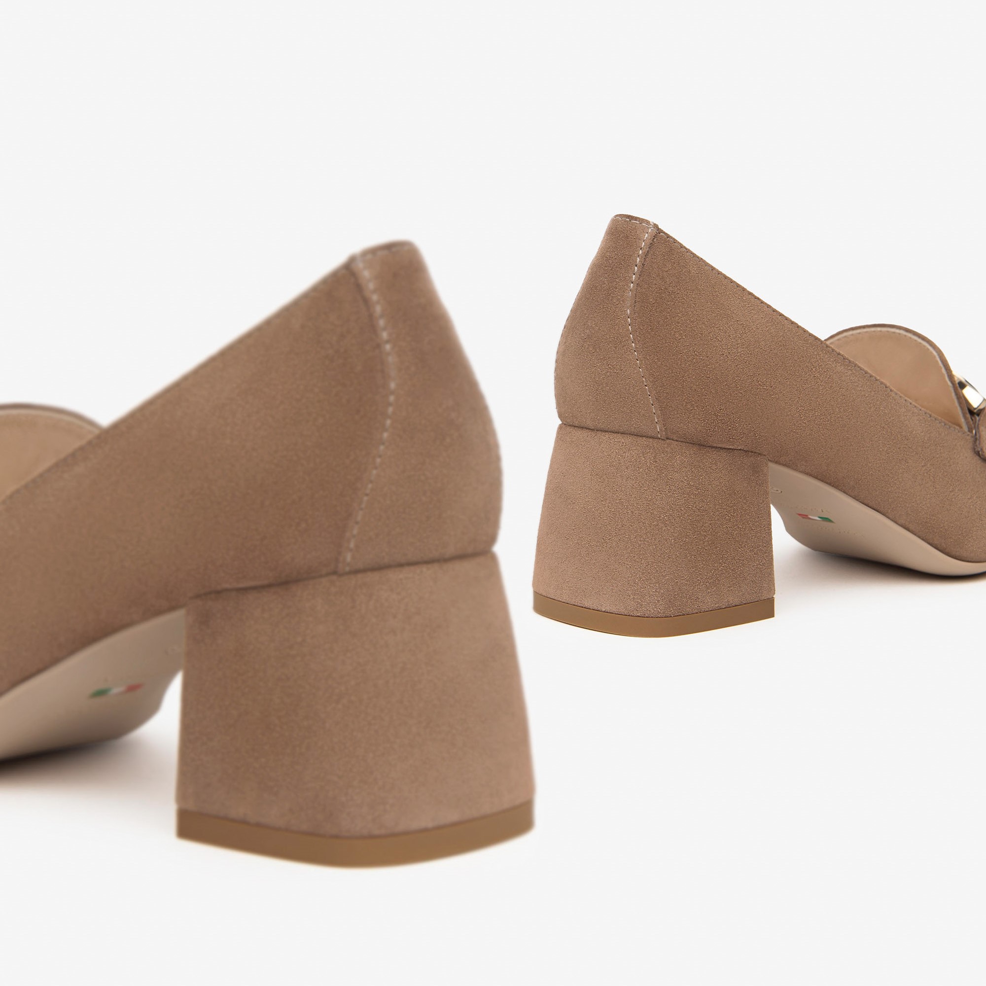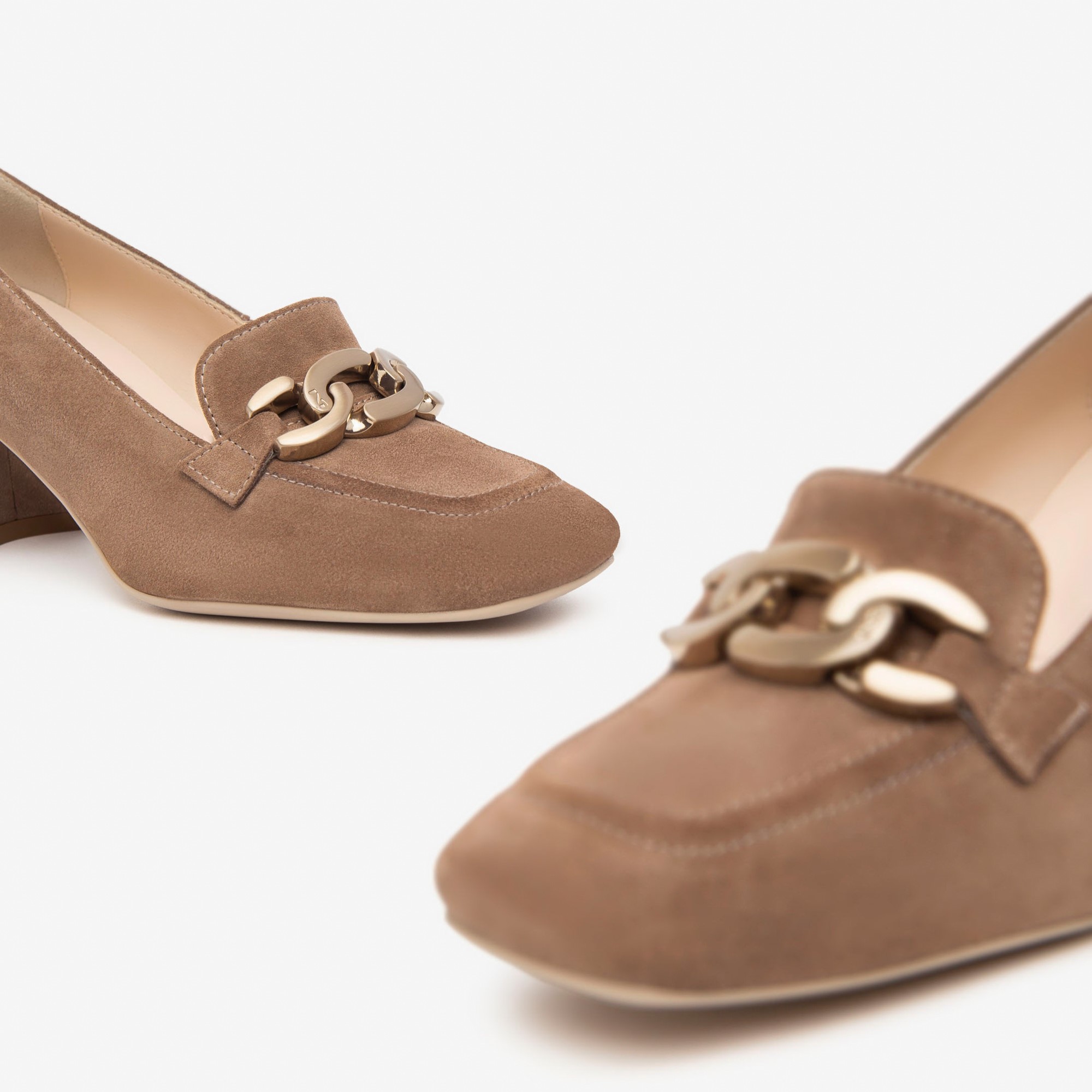 Nero Giardini velur braon kožne cipele na srednju stabilnu punu petu sa zlatnom šnalom.