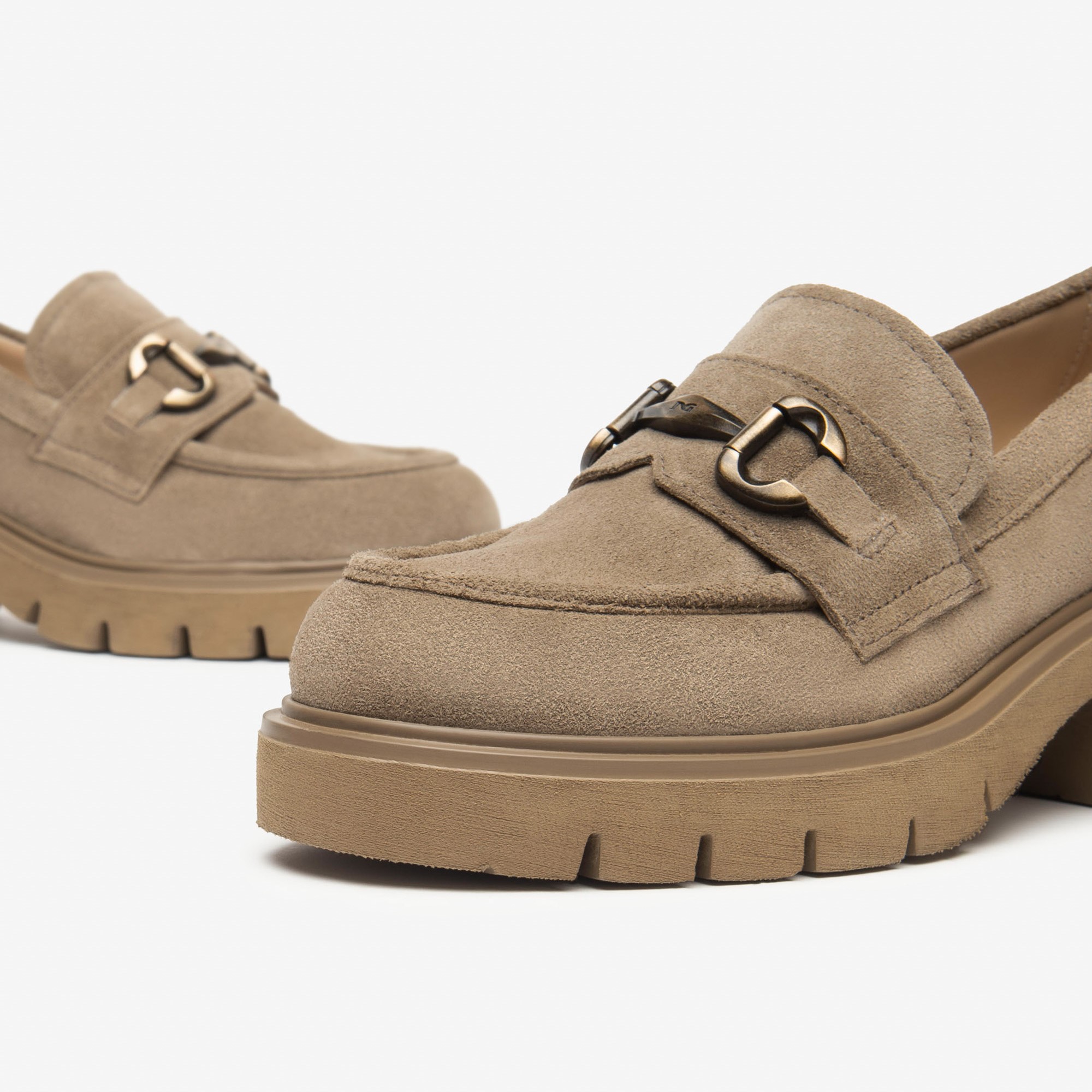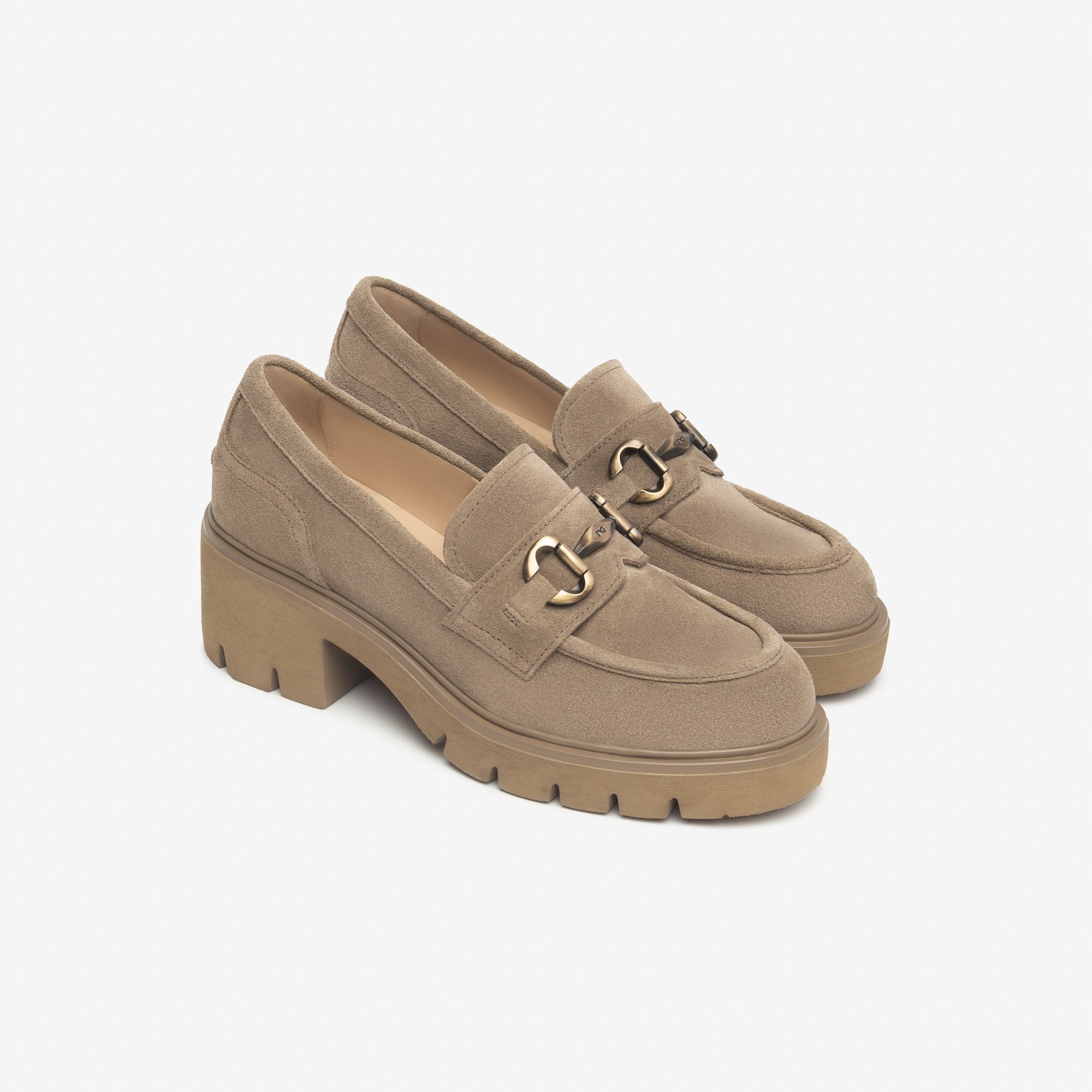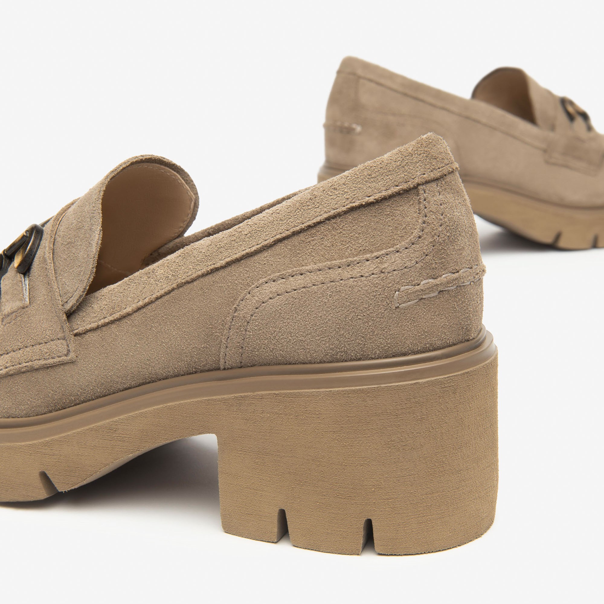Nero Giardini kožne velur cipele na debeloj potpetici od 5 cm u braon boji sa mat zlatnom šnalom na risu