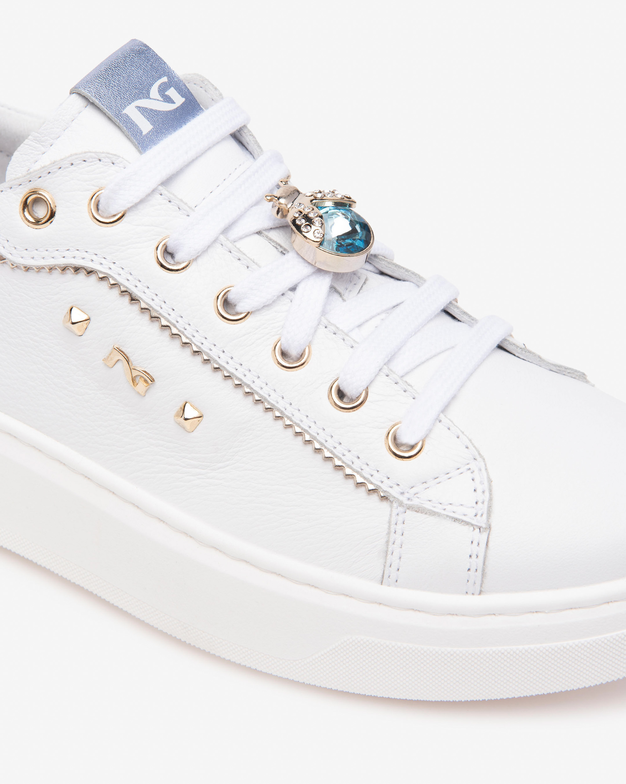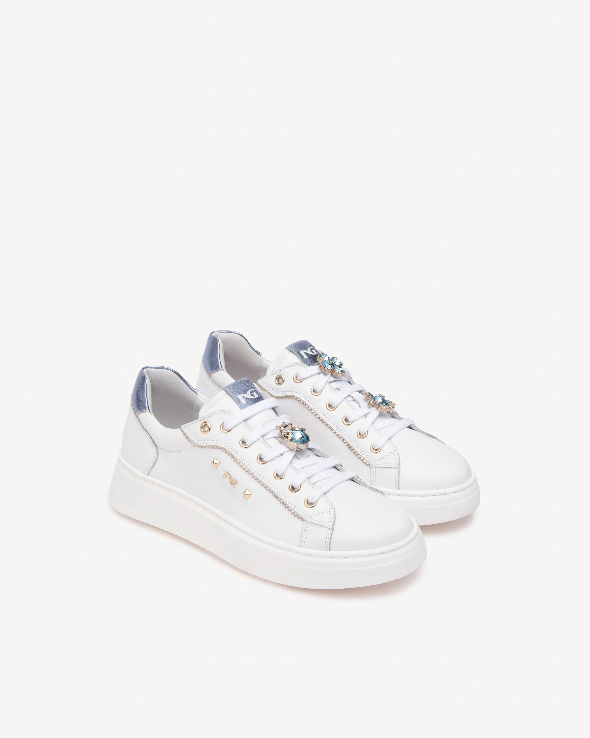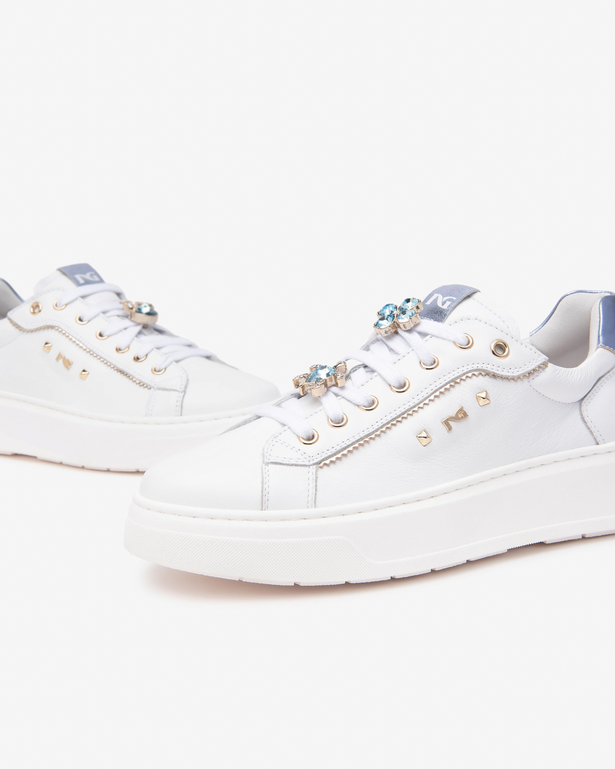 Nero Giardini kožne italijanske patike u beloj boji sa plavim laminat kožnim detaljima i plavim kristalnim šnalama koje se skidaju. Kalupi malo veći.