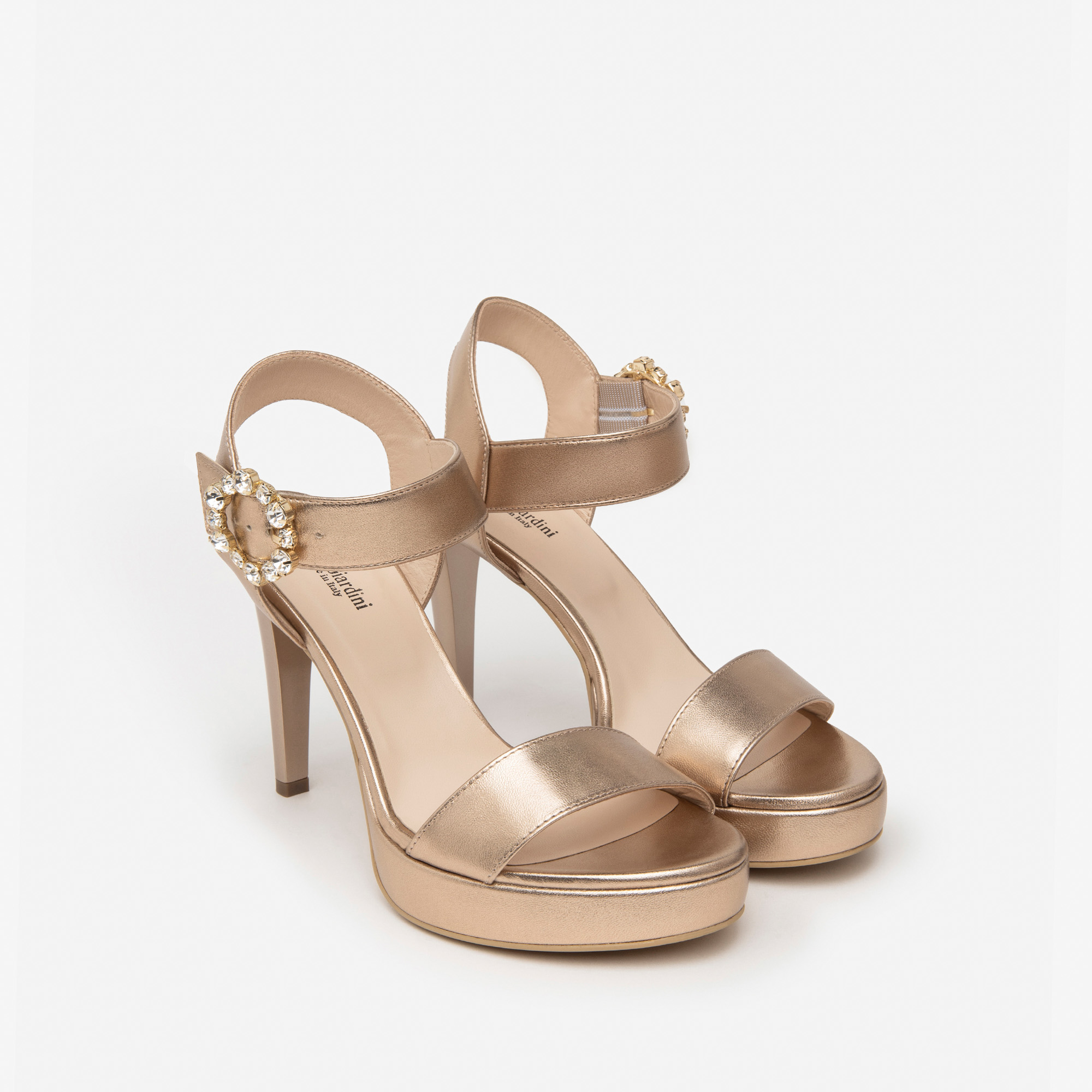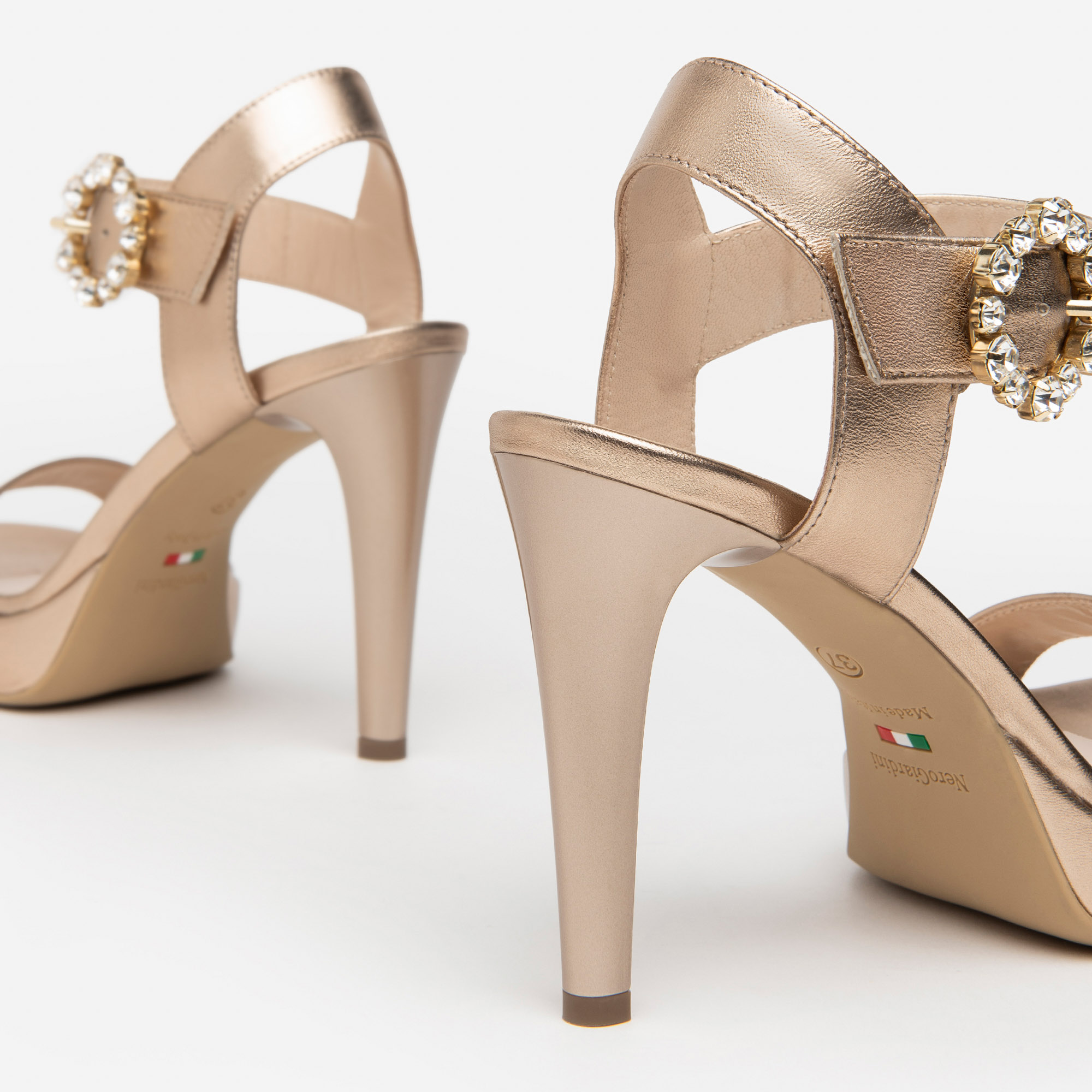 Nero Giardini elegantne kožne italijanske laminat zlatne sandale na visoku štiklu, sa platformom i šnalom od cirkona sa strane. Vrlo stabilne i udobne.
