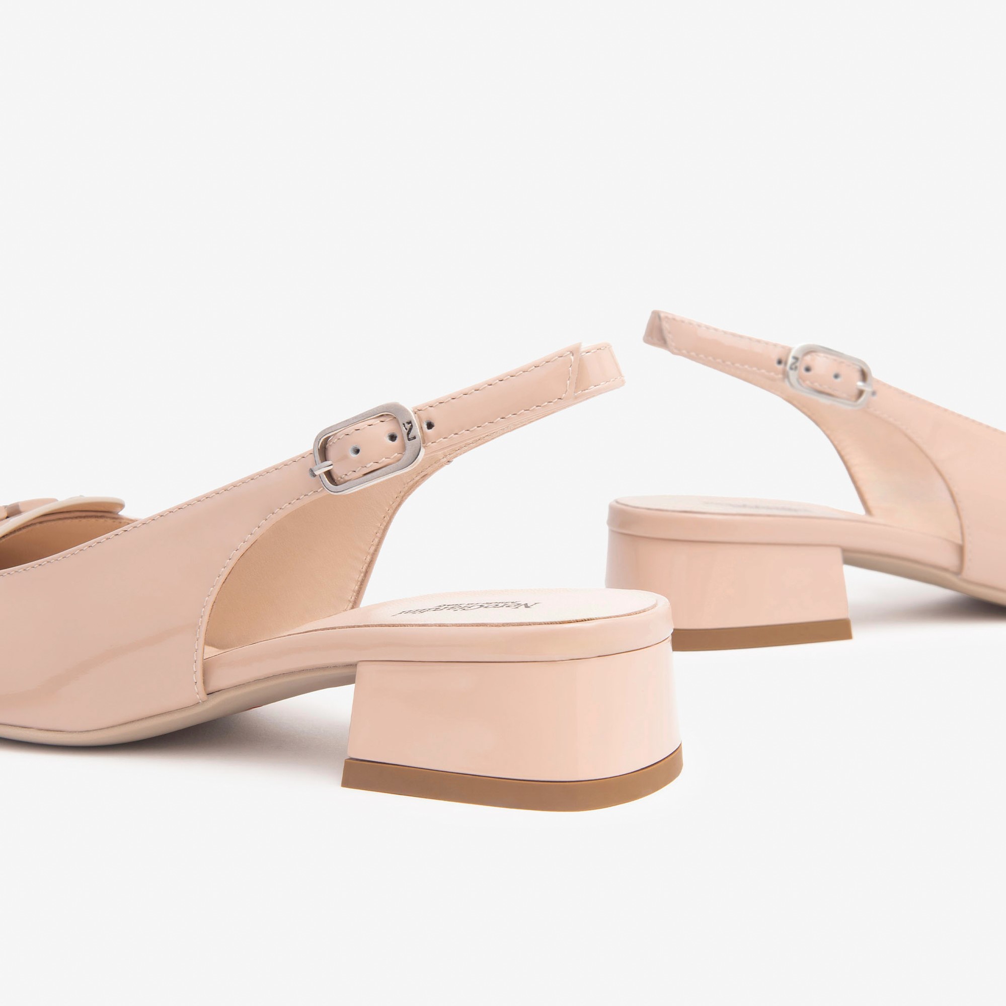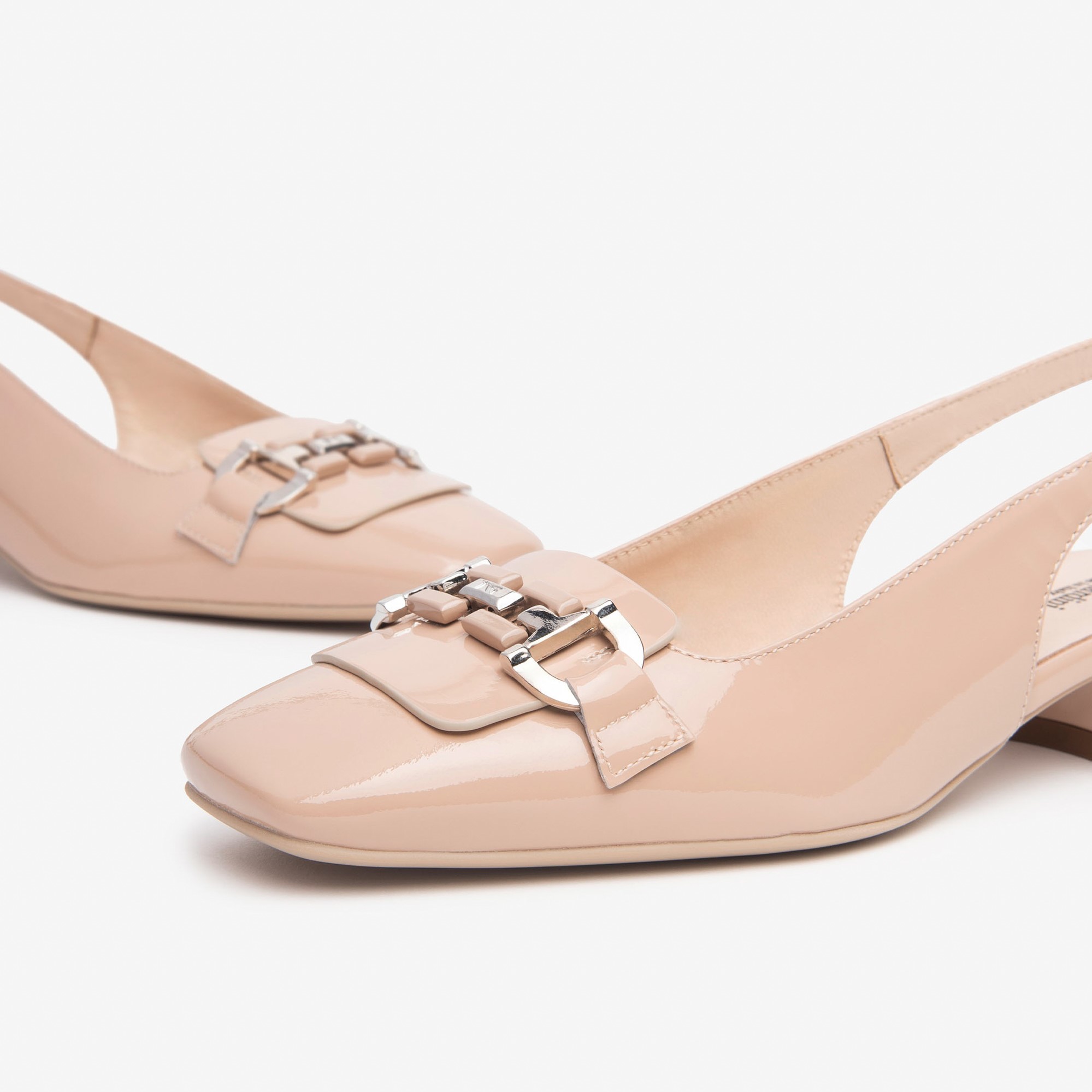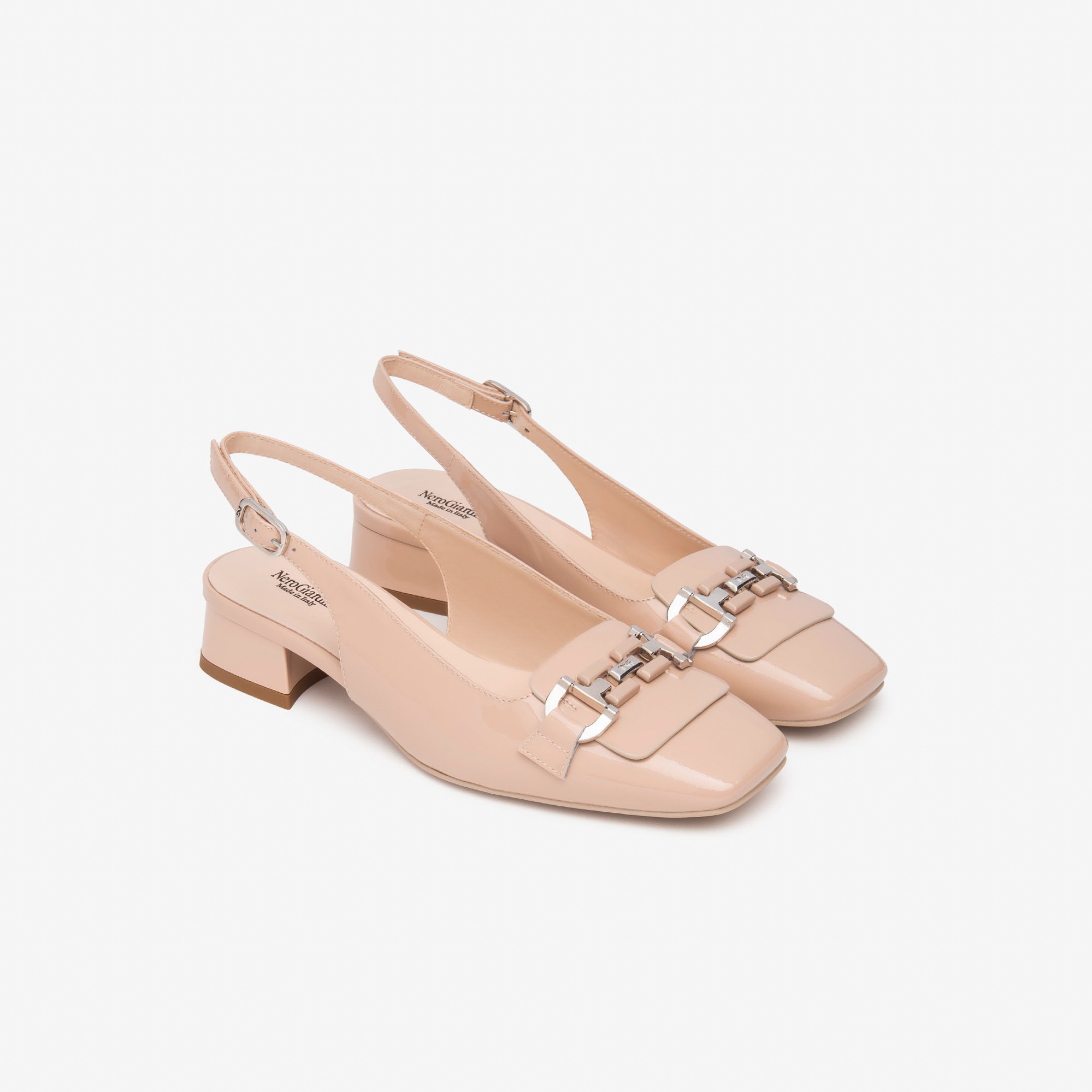 Nero Giardini italijanske kožne lakovane bež sandalete sa srebrnom šnalom na zaobljenom vrhu i potpetici od 2 cm.