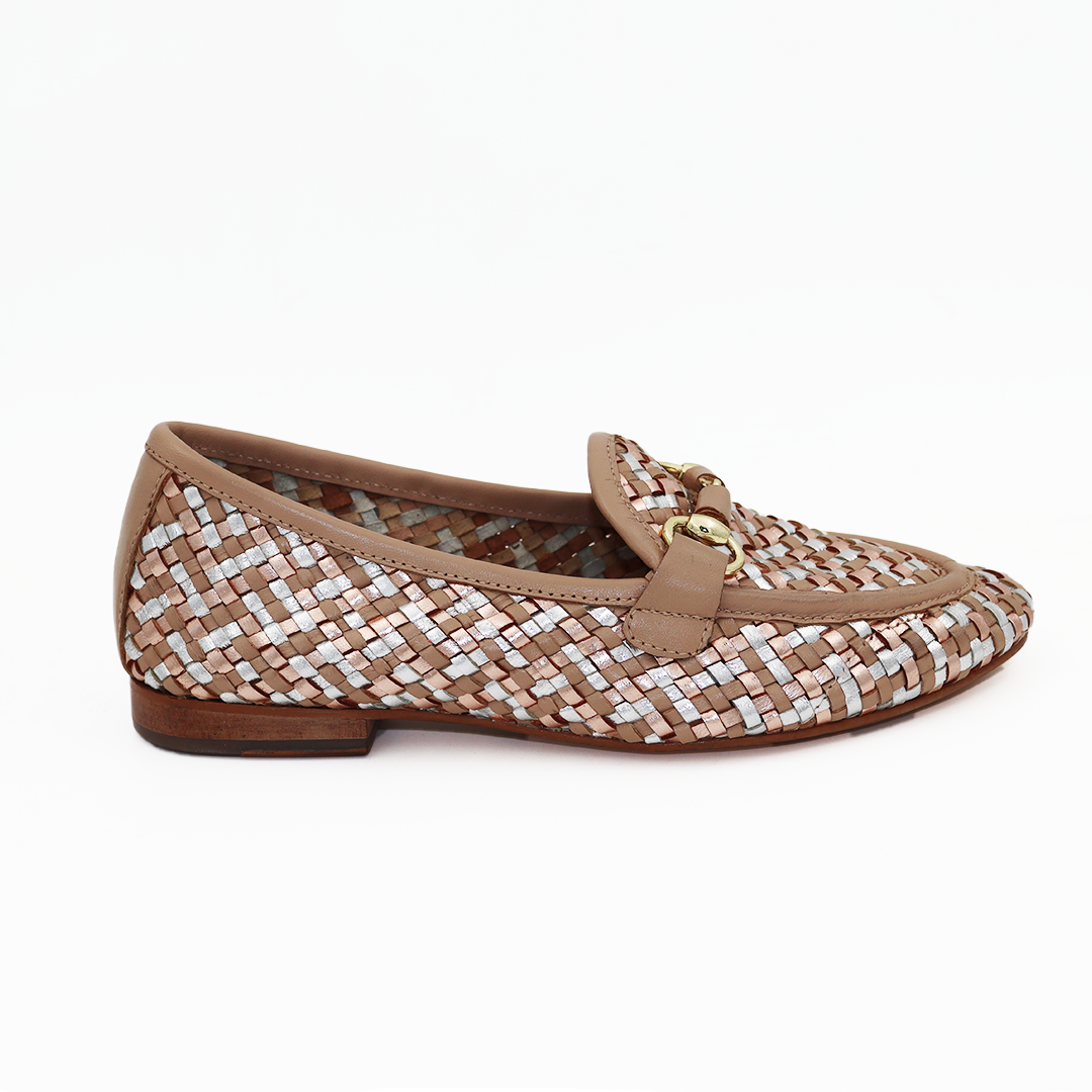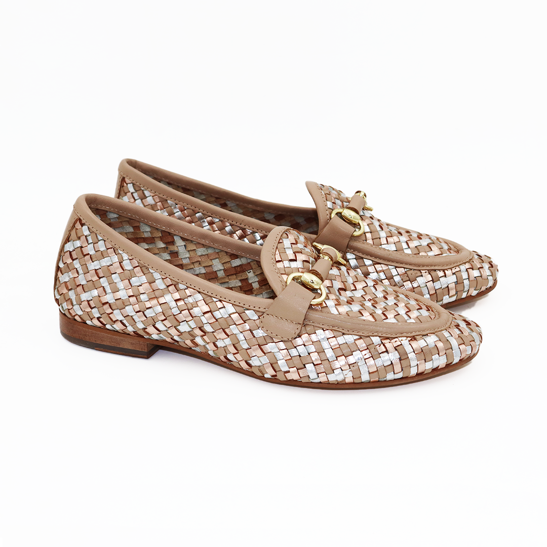 Nila Nila italijanske kožne cipele od bež-zlatne pletene kože na drvenom đonu sa dekorativnom zlatnom šnalom.