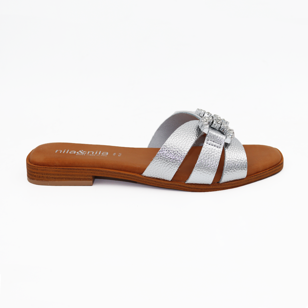 Nila Nila italijanske papuče u srebrnoj boji sa ukrasnom šnalom od srebrnih cirkona i kožnom tabanicom