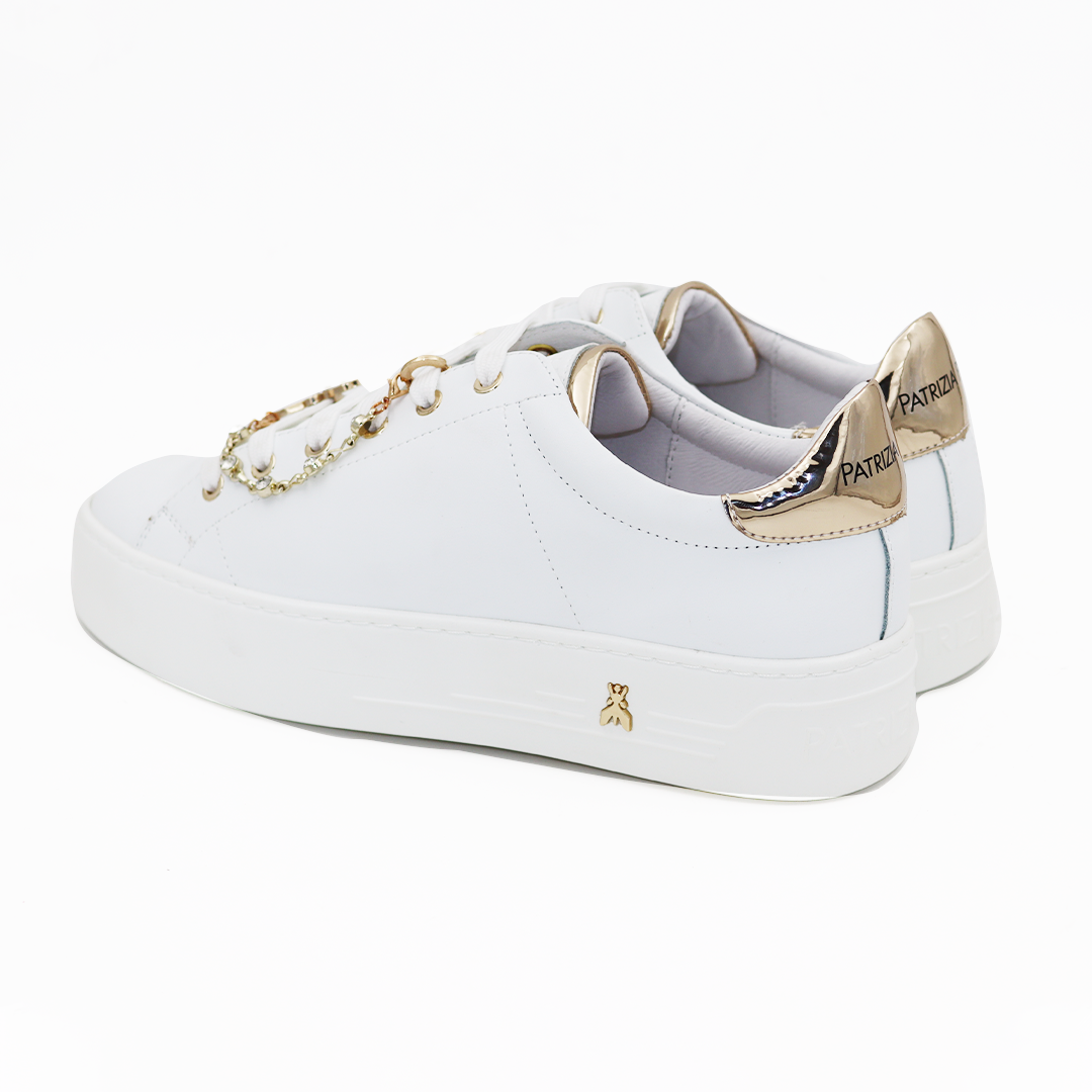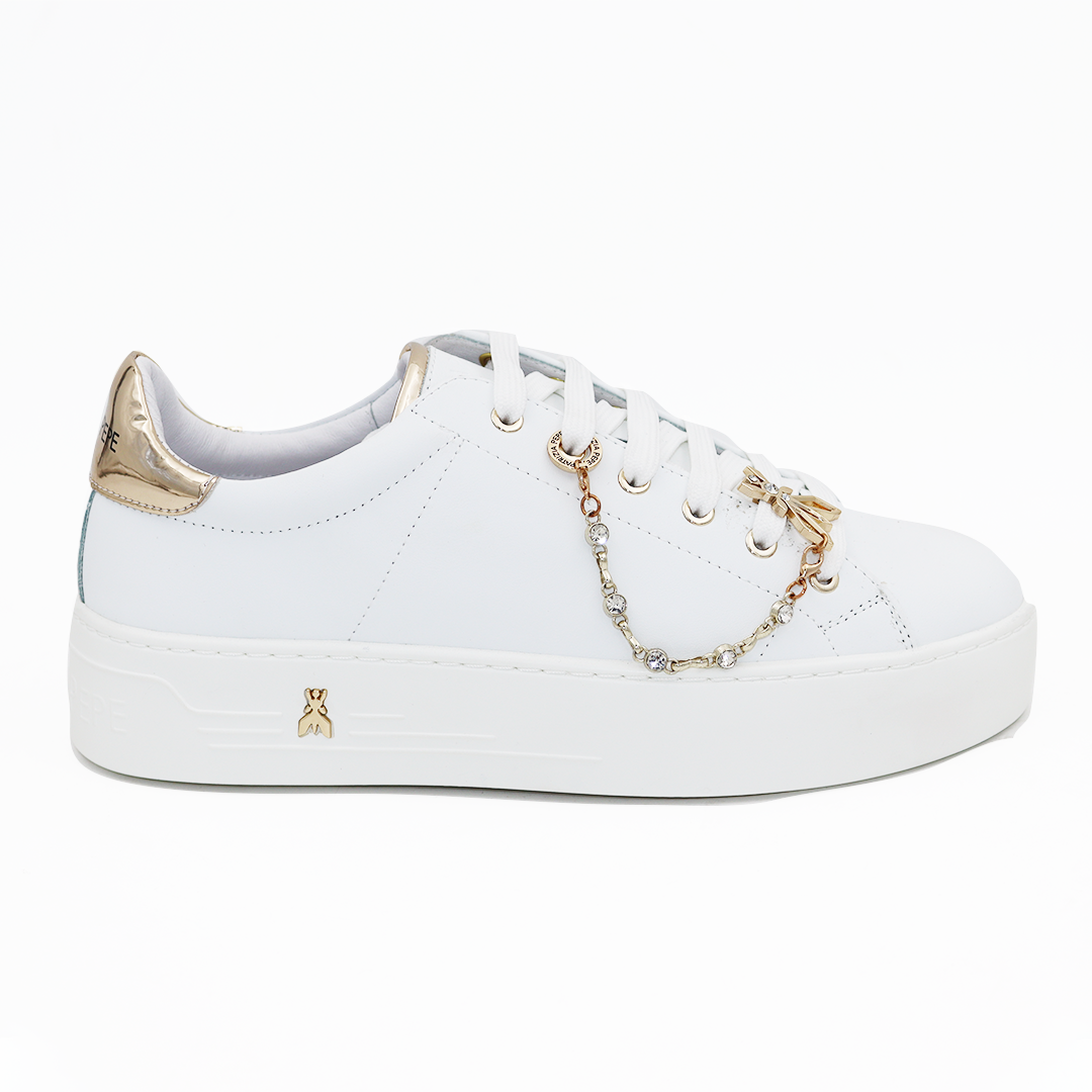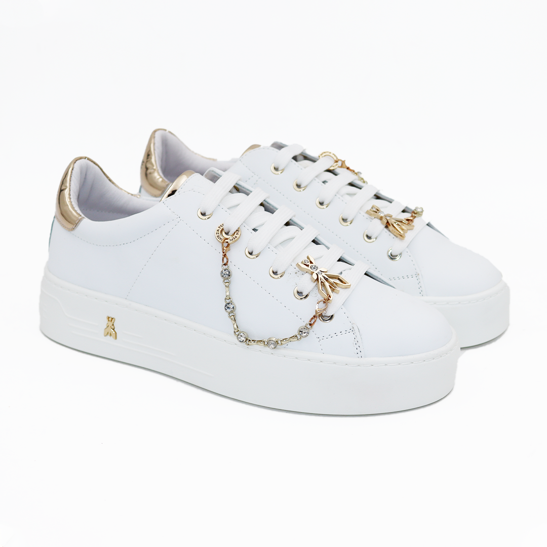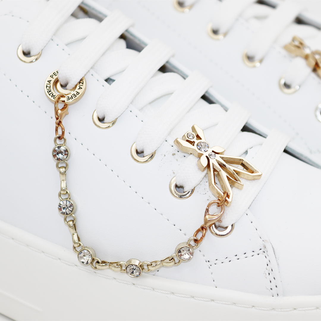 Patrizia Pepe kožne bele patike sa laminat zlatnom kožom na peti, i lančićem sa cirkonima između pčelica na pertlama
