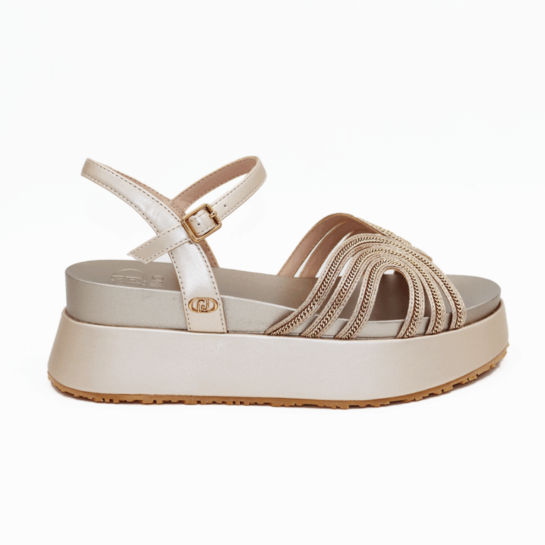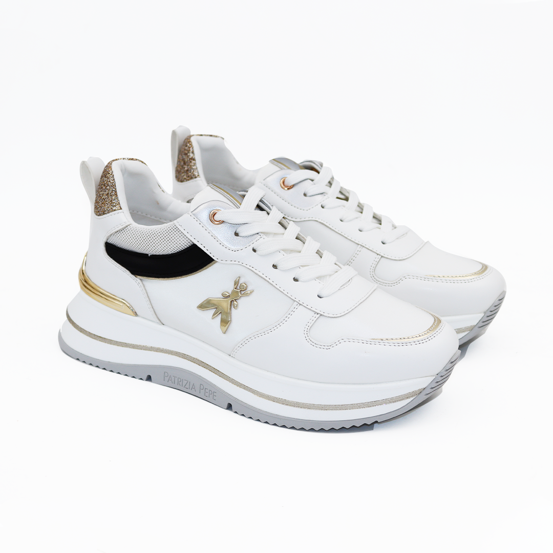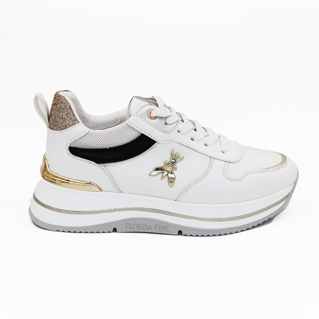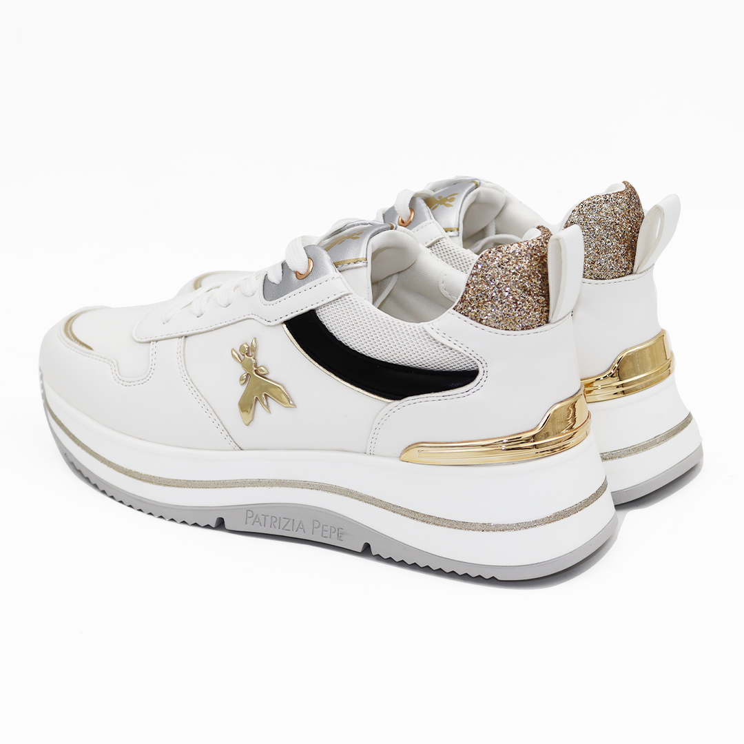 Patrizia Pepe bele patike na većem đonu sa zlatnim detaljima i zlatnim štrasom na peti