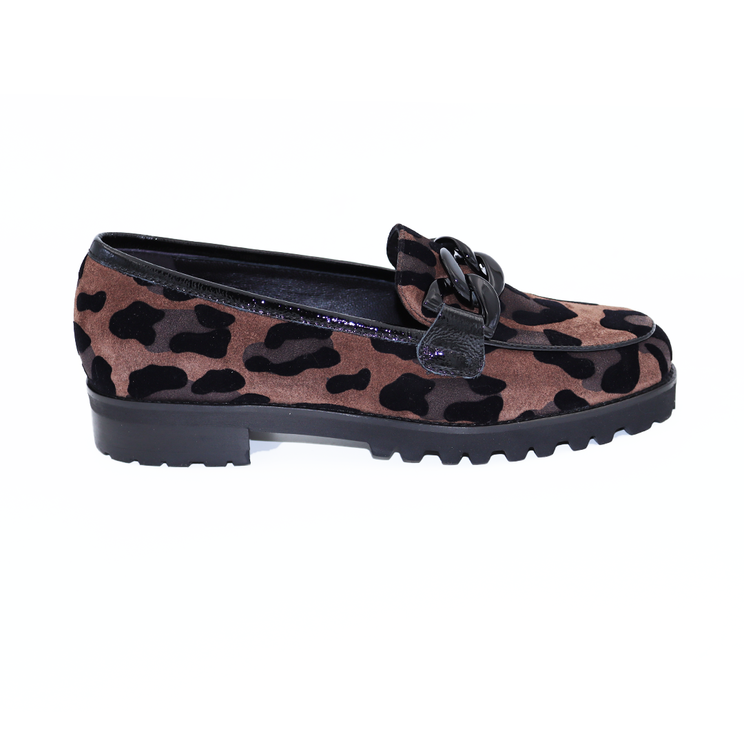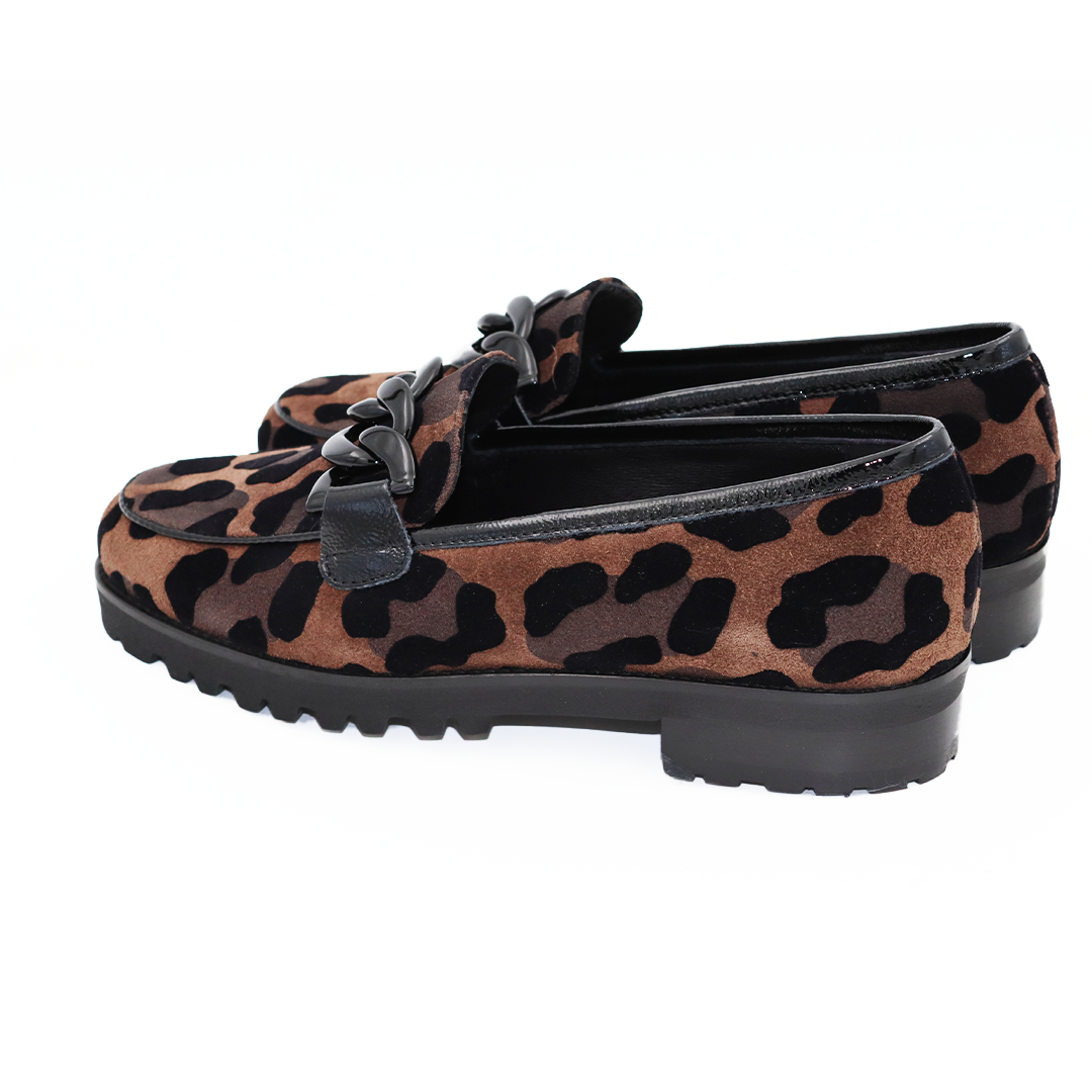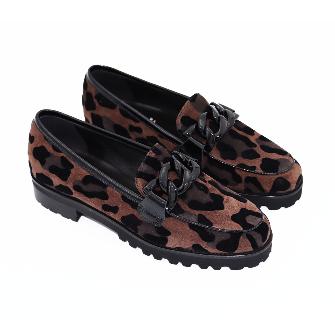 Paulette italijanske crne cipele-mokasine sa braon leopard printom na veluru, crnom šnalom i srednjim đonom