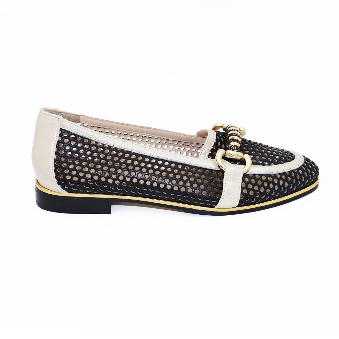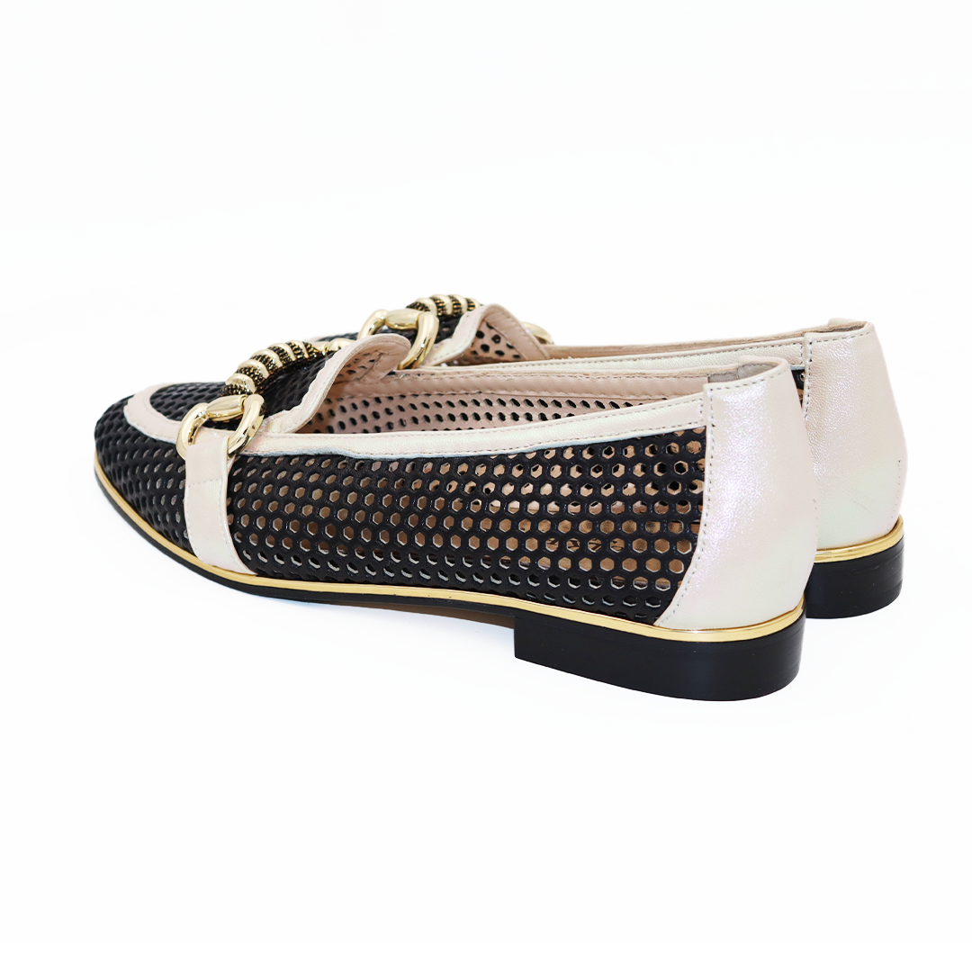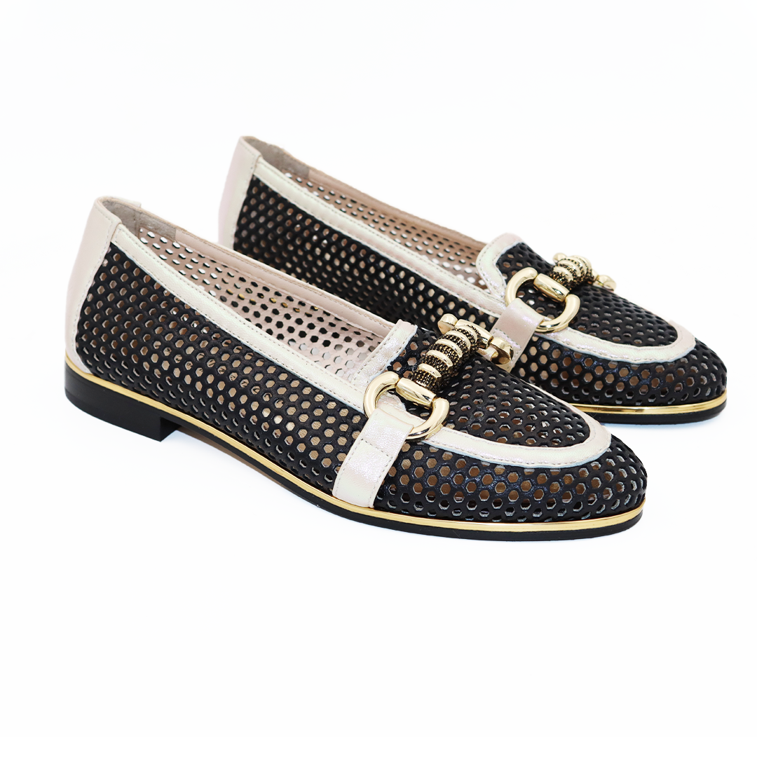 Renzoni kožne italijanske ručno-izrađene ravne cipele u crnoj boji i bež kođi sa zlatnom dekorativnim šnalom na blago zaobljenom vrhu
