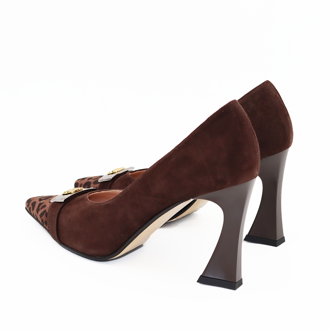 Renzoni italijanske cipele na potpetici od 9 cm u braon čokolada veluru sa leopard dezenom na špicu u dekorativnom šnalom