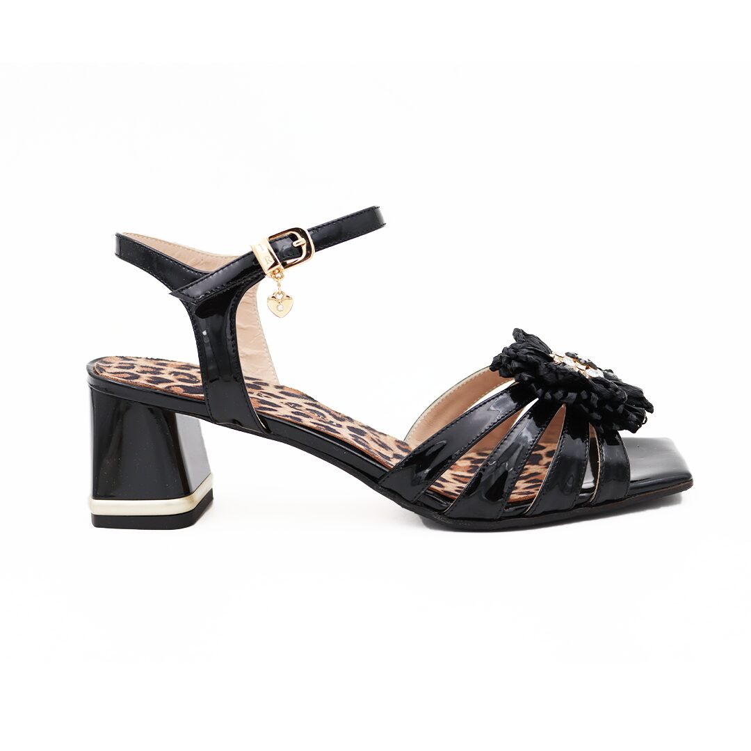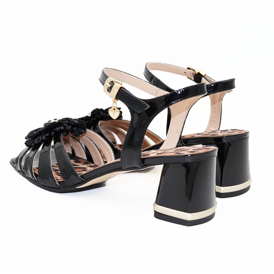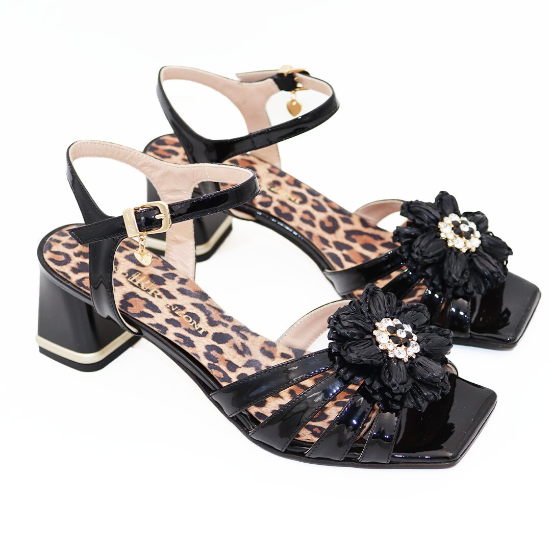 Renzoni italijanske kožne crne ručno-izrađene sandale na srednju stabilnu petu sa crnom cvet šnalom sa cirkonima i zlatnim detaljima