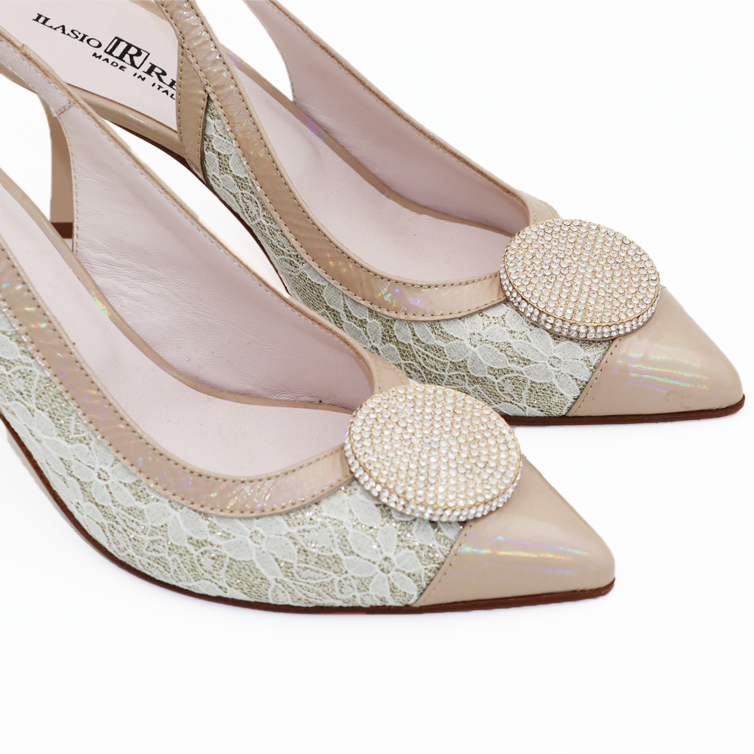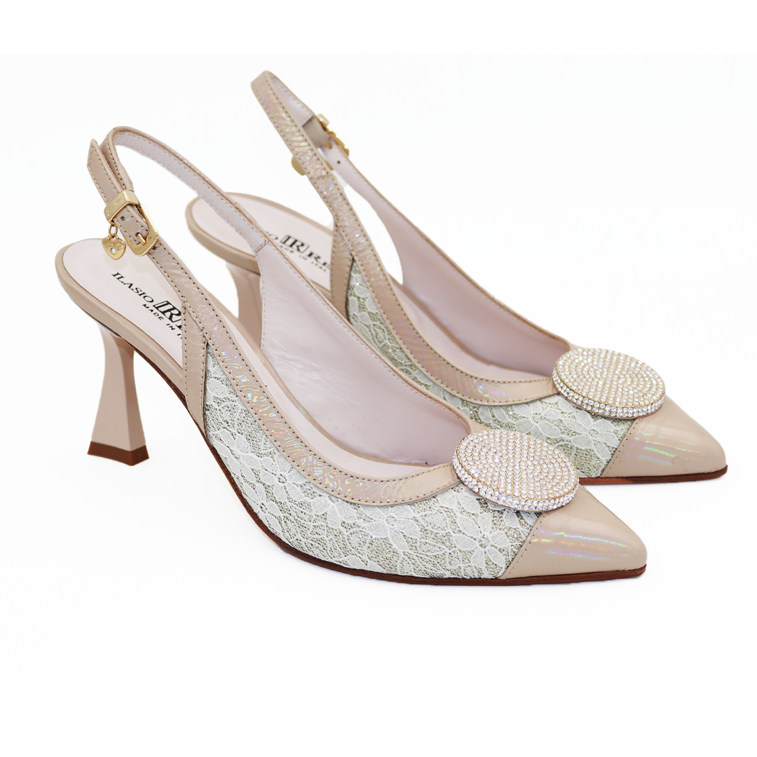 Ilasio Renzoni italijanske kožne sandalete ručno izrađene u Italiji sa bež čipskom sa strane i nude lakovanom kožom, sa ukrasnom šnalom od cirkona na špicu i potpeticom od 7 cm.