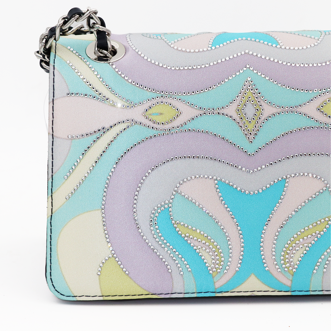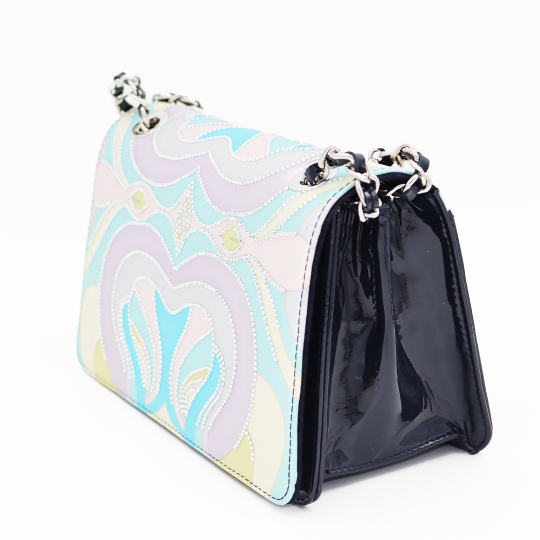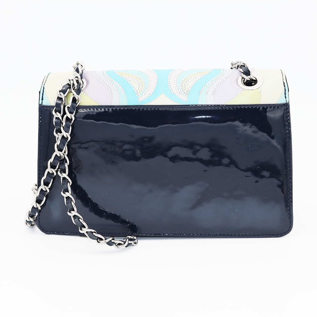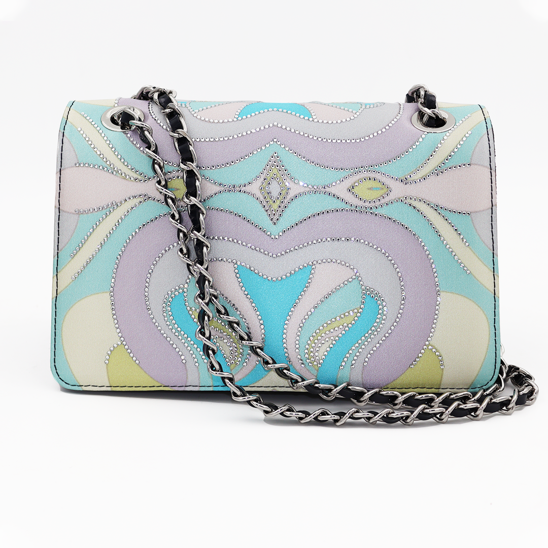 Ilasio Renzoni kožna italijanska tornica u sa lila-plavim dezenom sa cirkonima i teget lakovanom kožom sa strane.