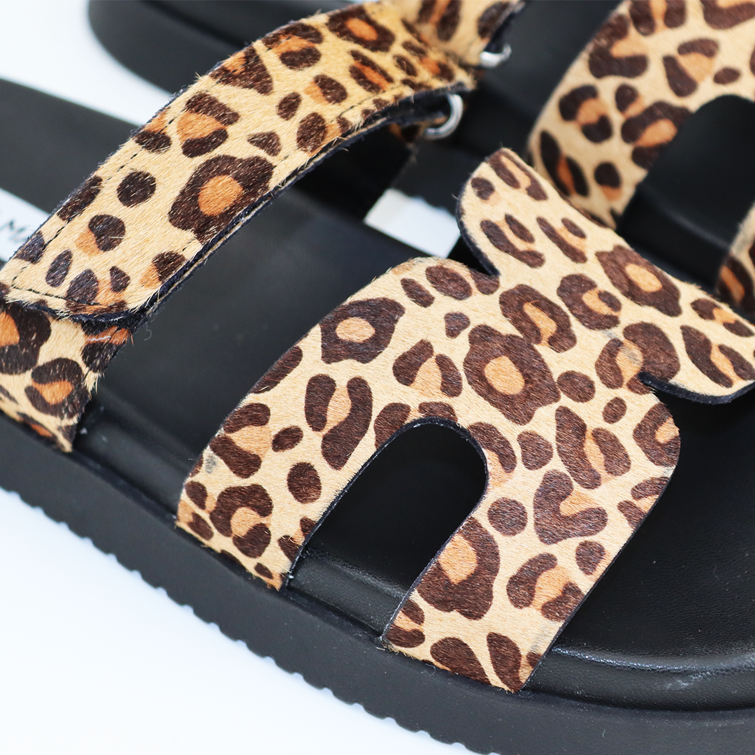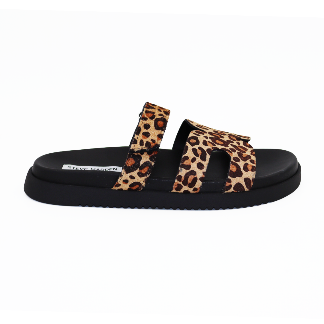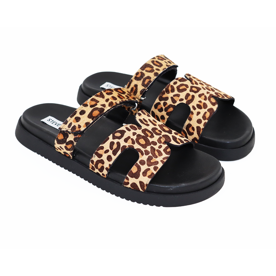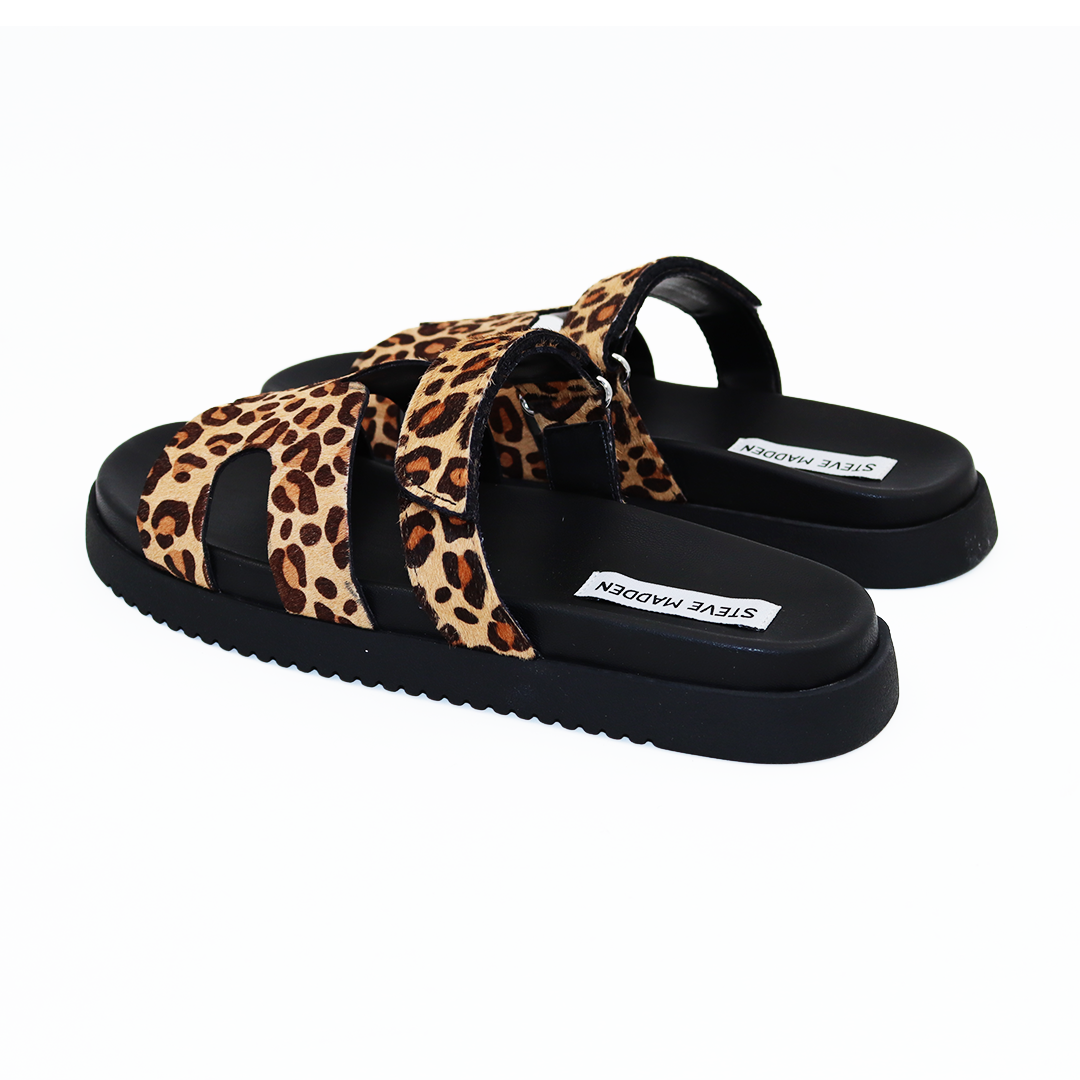 Steve Madden crne papuče sa dva kaiša u leopard printu na dlaci.