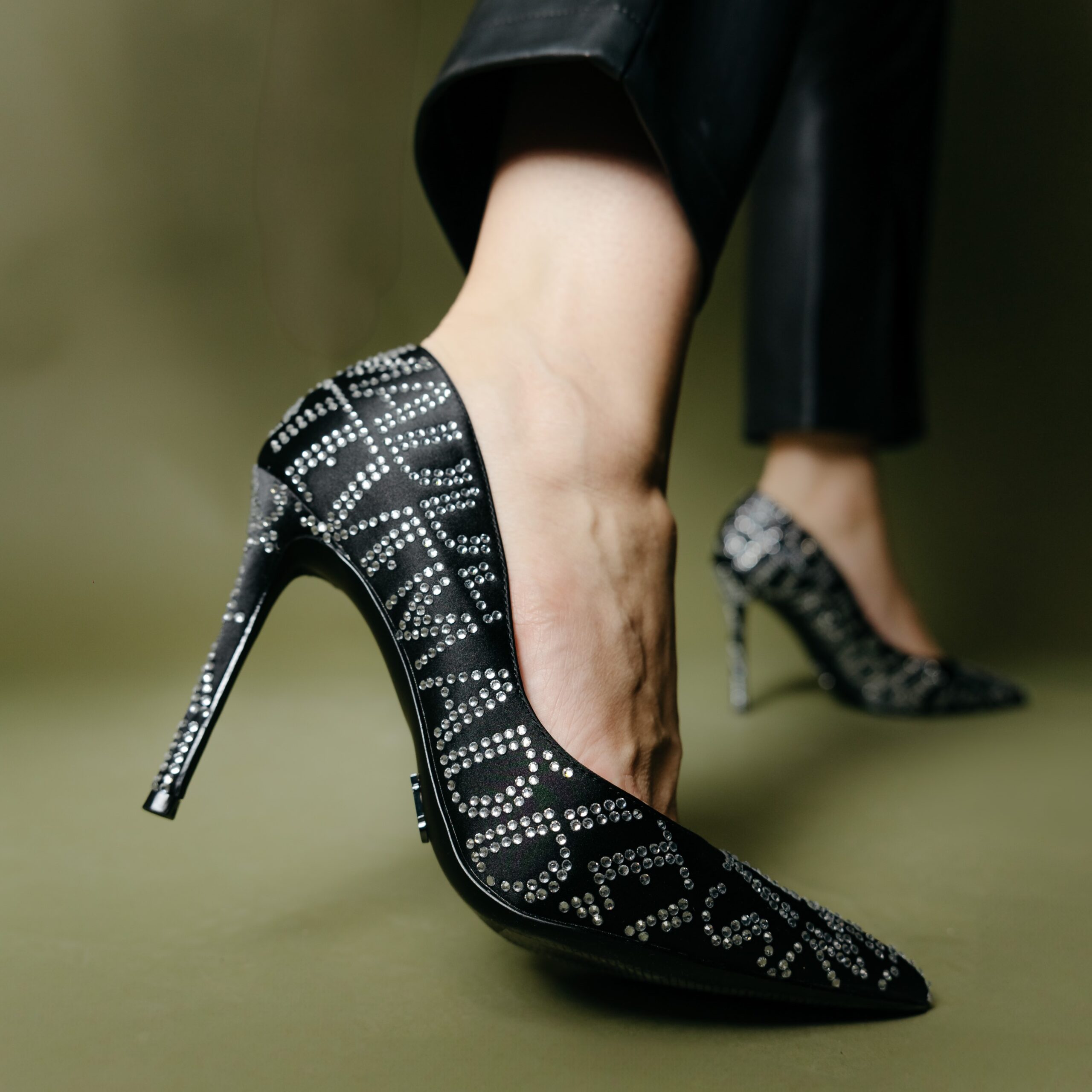 Steve Madden crne salonke na tankoj potpetici od 9 cm sa ispisom brenda u srebrnim cirkonima.
